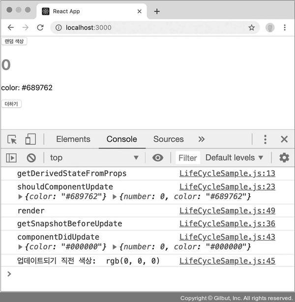 getDerivedStateProps는 부모에게서 받은 color 값을 state에 동기화하고 있습니다. 그리고 getSnapshotBeforeUpdate는 DOM에 변화가 일어나기 직전의 색상 속성을 snapshot 값으로 반환하여 이것을 componentDidUpdate에서 조회할 수 있게 했습니다.