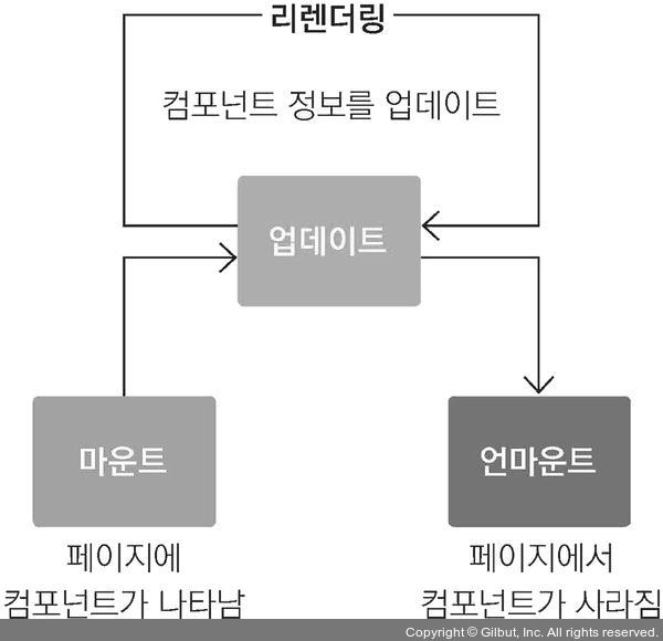 컴포넌트의 수명은 페이지에 렌더링되기 전인 준비 과정에서 시작하여 페이지에서 사라질 때 끝납니다.