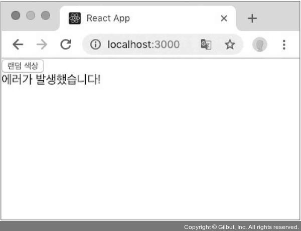 에러가 발생하면 componentDidCatch 메서드가 호출되며, 이 메서드는 this.state.error 값을 true로 업데이트해 줍니다. 그리고 render 함수는 this.state.error 값이 true라면 에러가 발생했음을 알려 주는 문구를 보여 줍니다.