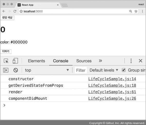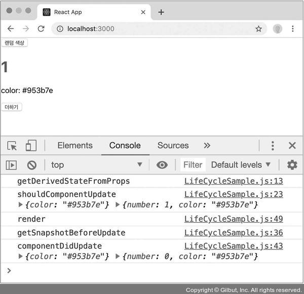 이 컴포넌트는 각 라이프사이클 메서드를 실행할 때마다 콘솔 디버거에 기록하고, 부모 컴포넌트에서 props로 색상을 받아 버튼을 누르면 state.number 값을 1씩 더합니다.