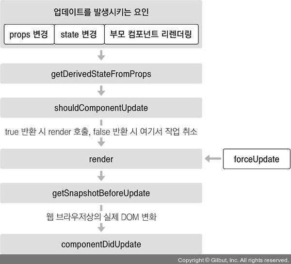 - shouldComponentUpdate: 컴포넌트가 리렌더링을 해야 할지 말아야 할지를 결정하는 메서드입니다. 이 메서드에서는 true 혹은 false 값을 반환해야 하며, true를 반환하면 다음 라이프사이클 메서드를 계속 실행하고, false를 반환하면 작업을 중지합니다. 즉, 컴포넌트가 리렌더링되지 않습니다. 만약 특정 함수에서 this.forceUpdate() 함수를 호출한다면 이 과정을 생략하고 바로 render 함수를 호출합니다.