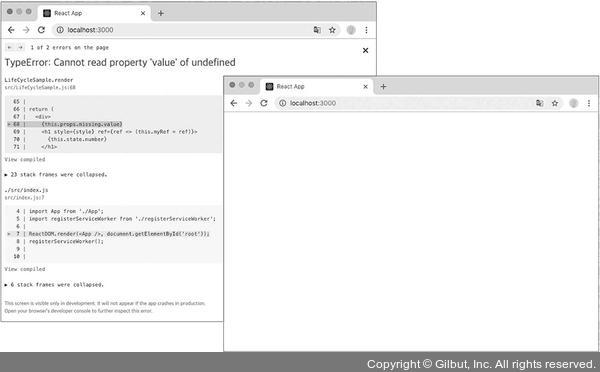 저장하고 나면 그림 7- 9 왼쪽과 같이 에러가 발생할 것입니다. 이렇게 어디에서 에러가 발생했는지 알 수 있는 정보가 나타난 것은 우리가 현재 개발 서버를 실행 중이기 때문입니다. 해당 페이지의 오른쪽 상단에 있는 X 버튼을 누르면 오류 창이 닫힙니다. 닫히고 나면, 그림 7- 9의 오른쪽과 같이 아무것도 보이지 않고 흰 페이지만 남습니다.
