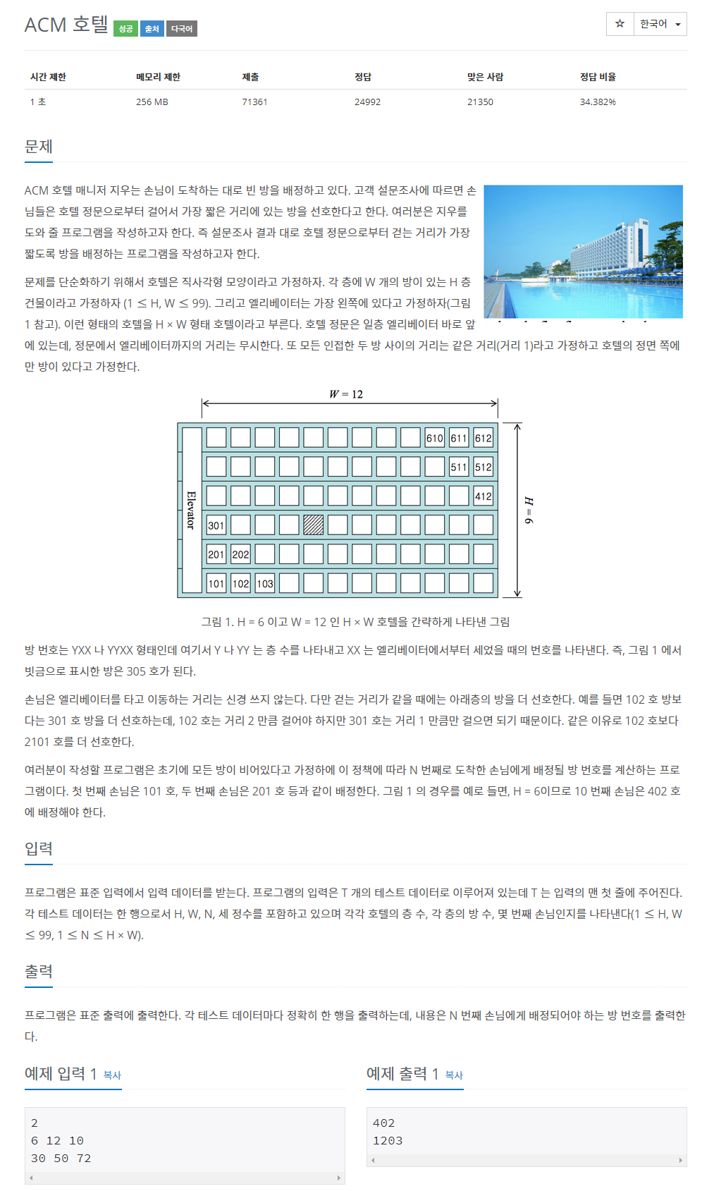 N -= H을 N이 0이 될 때까지 반복하는 동안 W를 카운팅하면 손님이 머무르게 될 그 층의 룸넘버를 알 수 있습니다.
