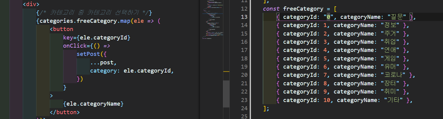 오류가 나서 한번 더 고쳤다 ^^.. 조건을 다시 되돌리고, setPost를 할때 `${ele.categoryId}` 이렇게 string으로 변환해서 넣어주기로했다.
